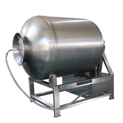 真空滾揉機是將塊狀肉在真空狀態(tài)下,將肉的纖維打開。通過筒體的轉動進行滾揉、摔打,使腌制原料充分的進入肉的纖維中。從達到快速腌制跟嫩化的作用。從而獲得高口感品質的肉。也使肉的出成率獲得一定量的增加。